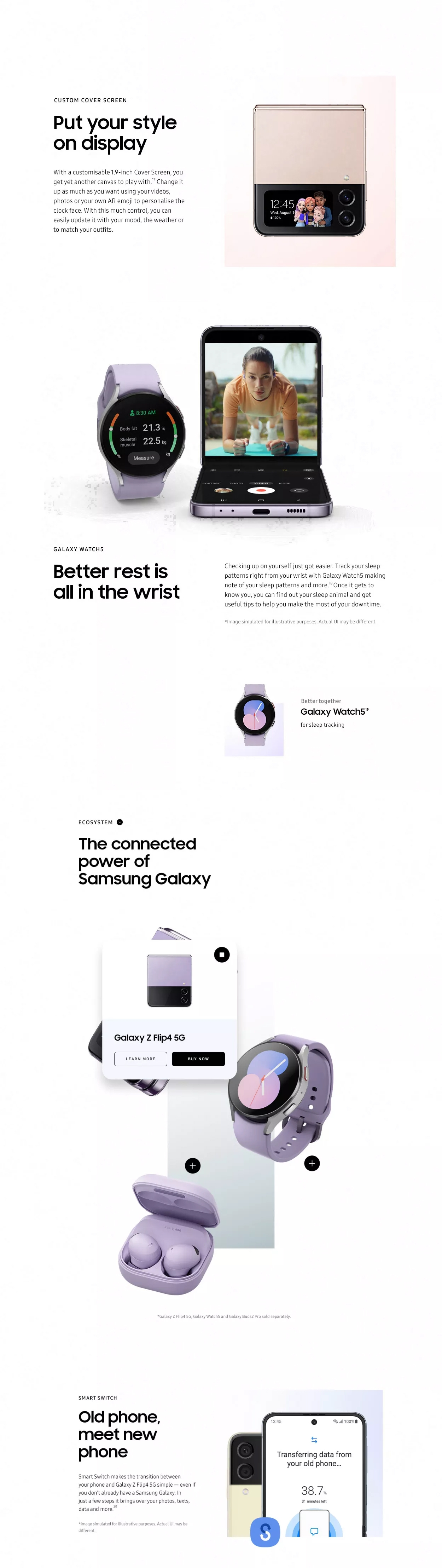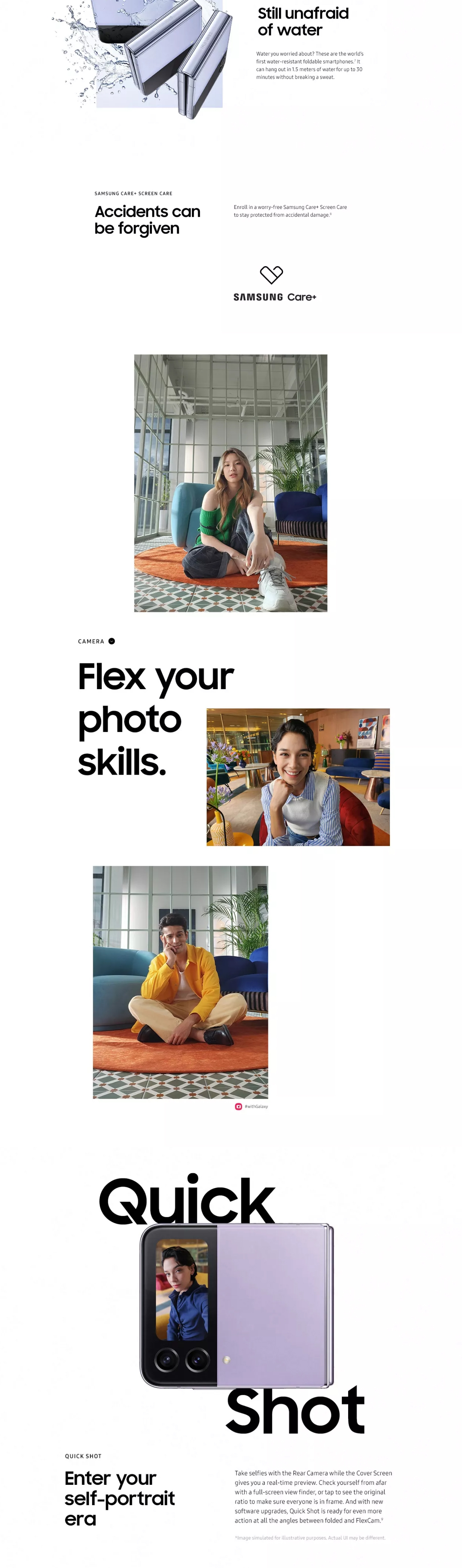 The Galaxy Z Flip4 enhances our users’ favorite features, making it the ultimate tool for self-expression. Its compact clamshell design offers unique experiences not available on any other smartphone.