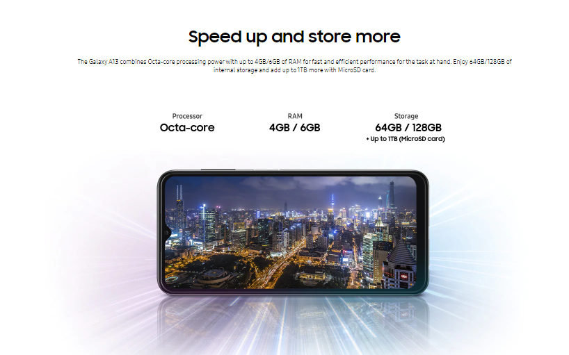 - NETWORKTechnologyGSM / HSPA / LTELAUNCHAnnounced2022, March 04StatusAvailable. Released 2022, March 23BODYDimensions165.1 x 76.4 x 8.8 mm (6.5 x 3.01 x 0.35 in)Weight195 g (6.88 oz)BuildGlass front (Gorilla Glass 5), plastic frame, plastic backSIMSingle SIM (Nano-SIM) or Dual SIM (Nano-SIM, dual stand-by)DISPLAYTypePLS LCDSize6.6 inches, 104.9 cm2 (~83.2% screen-to-body ratio)Resolution1080 x 2408 pixels, 20:9 ratio (~400 ppi density)ProtectionCorning Gorilla Glass 5PLATFORMOSAndroid 12, One UI 4.1ChipsetExynos 850 (8nm)CPUOcta-core (4x2.0 GHz Cortex-A55 & 4x2.0 GHz Cortex-A55)GPUMali-G52MEMORYCard slotmicroSDXC (dedicated slot)Internal32GB 3GB RAM, 64GB 4GB RAM, 128GB 4GB RAM, 128GB 6GB RAM